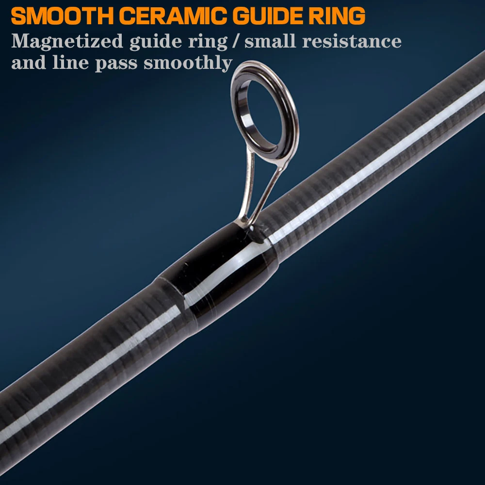 The segmented, comfortable grip and EVA handle not only provide a comfortable and non-slip grip for your hands, but also assist in reducing labor, allowing you to fish for longer periods of time without experiencing fatigue. The smooth ceramic guide ring reduces friction and effectively dissipates heat without damaging the fishing line, ensuring that you can fish with ease and without fear of damage to your equipment.