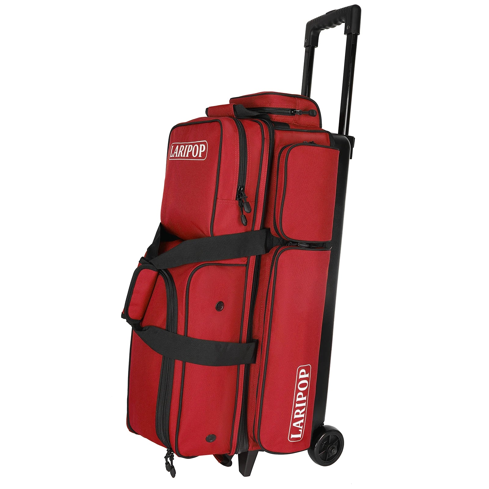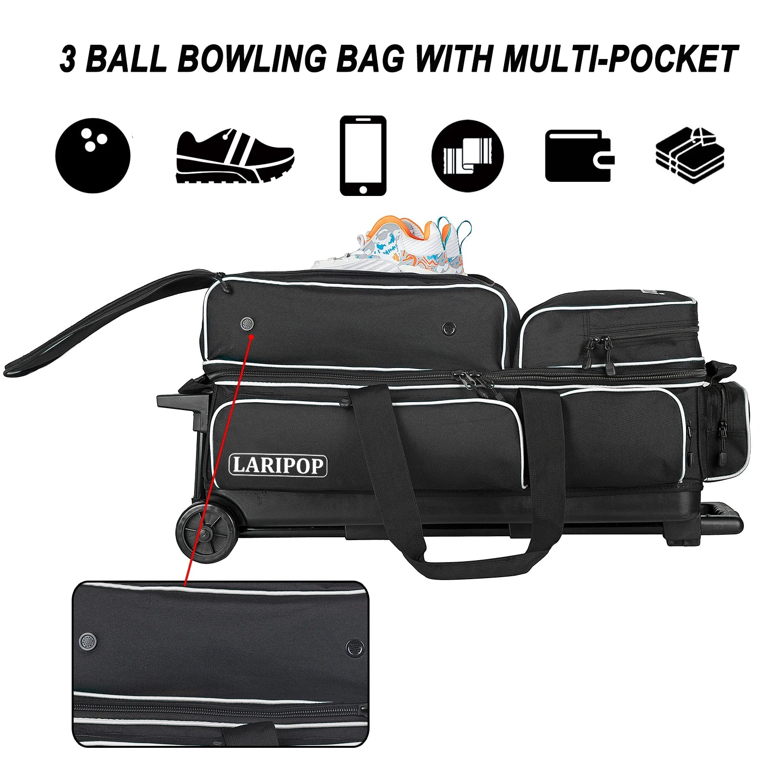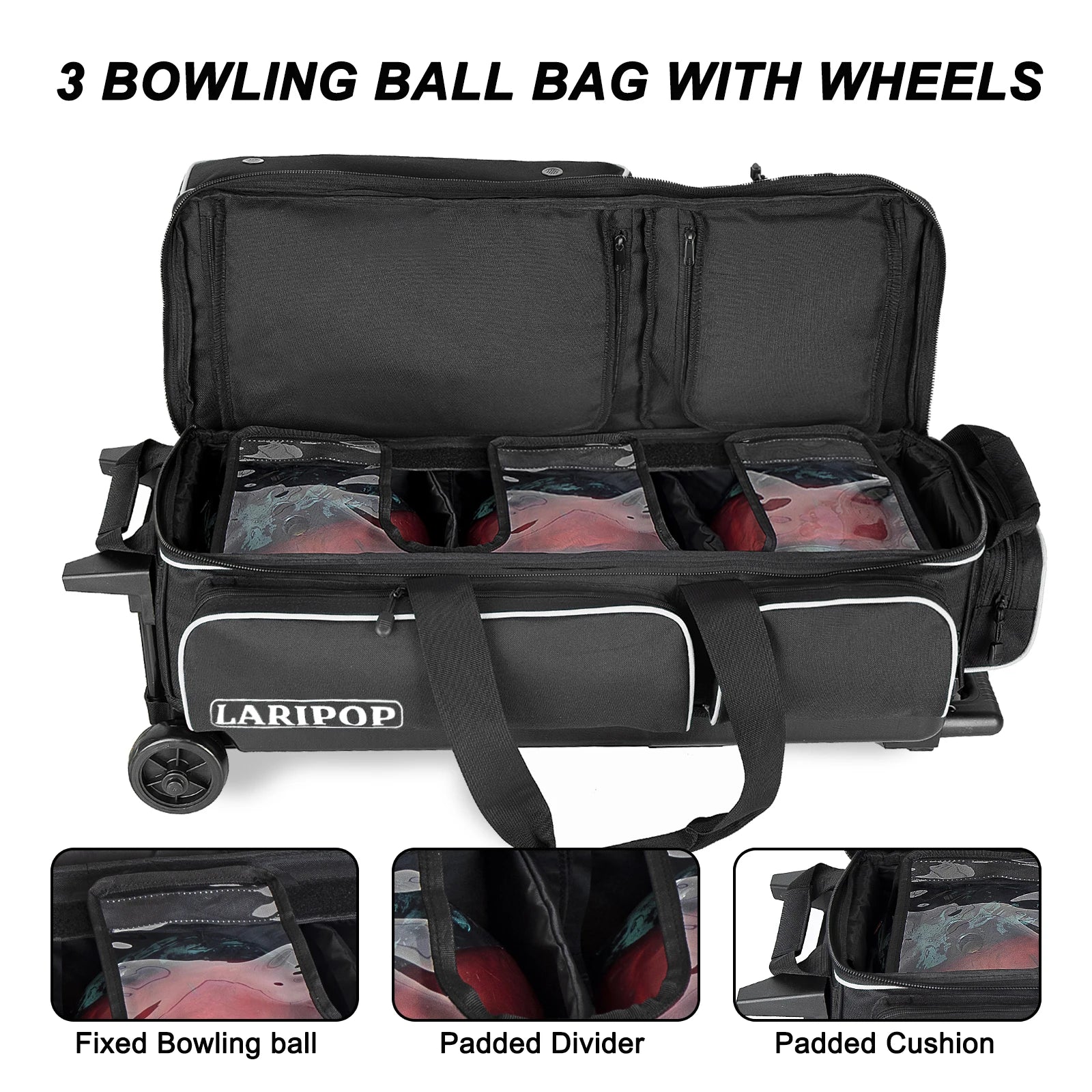 3 Bowling Ball Bag With Wheels - Rolling Bag for Balls & Accessories - Retractable Handle Extends to 38"