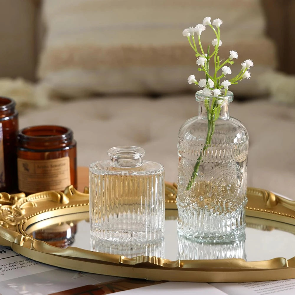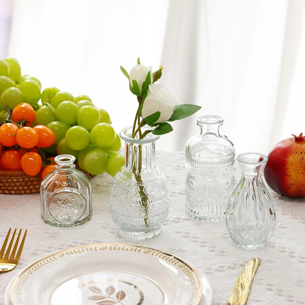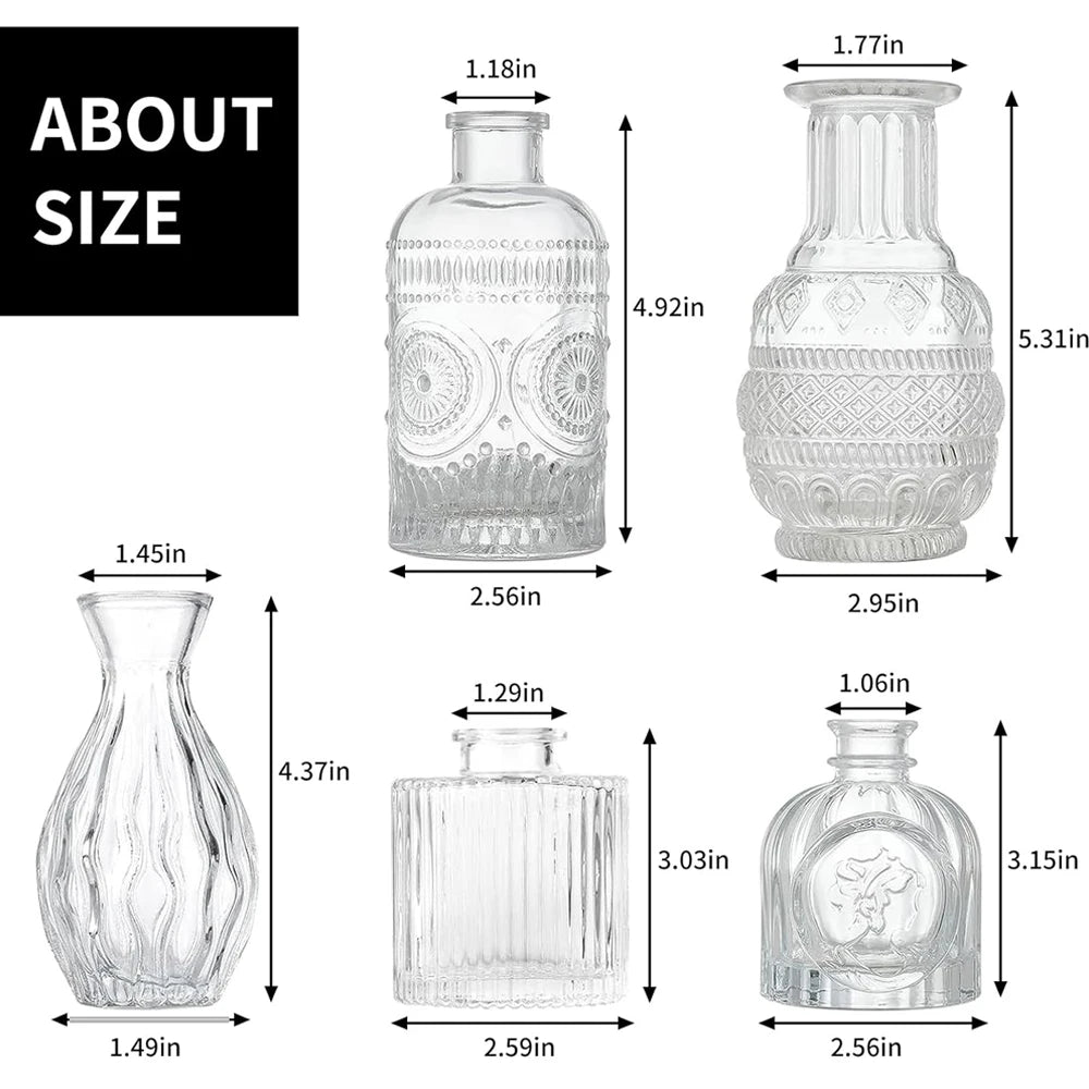 Vintage style: Small bud vase set of 5, each transparent glass vase surface is decorated with vintage and elegant relief patterns, retro and elegant and classic, can be used for center table decoration as aesthetic home decor, enhance the interior space style!